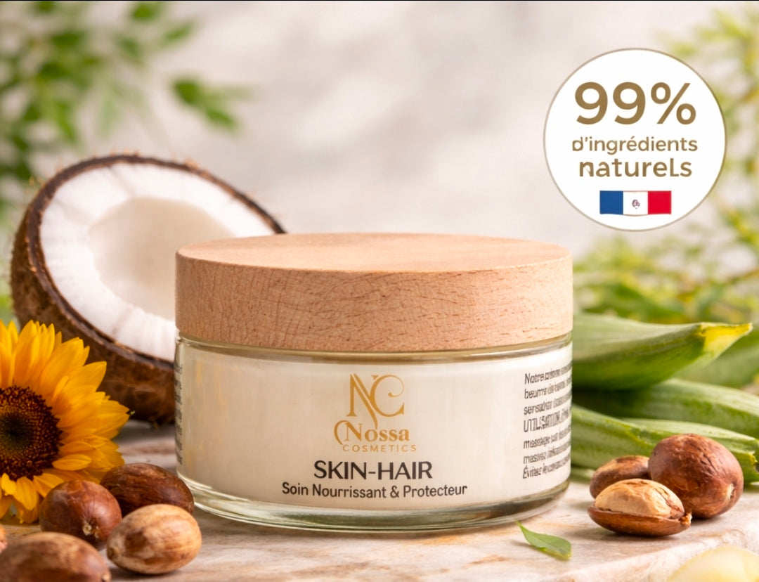 Découvrez SKIN-HAIR, un soin multi-usage formulé à partir d'ingrédients d'origine naturelle, conçu pour nourrir intensément, protéger durablement et sublimer la peau comme les cheveux.